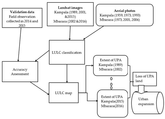 Furthermore, a total of 430 validation points for LULC were identified during fieldwork and selected based on matching ground and image interpretation LULC classes. Validation points were constrained to sites with time-invariant LULC classes, targeting dominant categories, such as built-up areas, agricultural land, wetlands, savannah, water surfaces, and grazing lands in Mbarara. An overview of the data sources and processes employed in this study, focusing on the determination of agricultural land loss and overall LULC transitions in both cities, is illustrated in Figure 2.