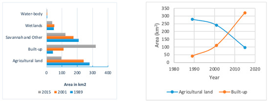 Quantitatively, the initial proportion of agricultural land was six times the size of the built-up area. However, the built-up area increased from 41.54 km2 to 320.68 km2 between 1989 and 2015. Concurrently, agricultural land decreased from about 279.5 km2 in 1989 to about 97.12 km2 by 2015 (Figure 3). This indicates an inverse relationship between the overall change in the built-up area and agricultural land, as depicted by the observable decrease in agricultural land between 1989 and 2015 with a large proportion transitioning to the built-up category (Figure 3).
