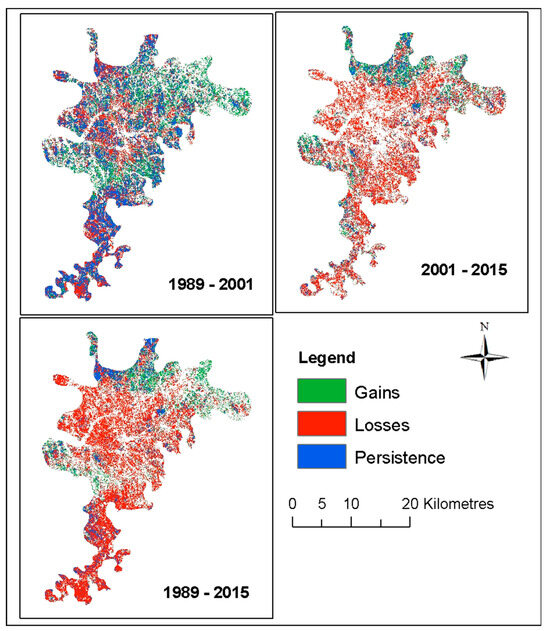 Figure 4 shows the spatial distribution of the agricultural LULC class changes in Kampala between 1989 and 2015. Agricultural land had a high persistence and gain between 1989 and 2001; however, between 2001 and 2015 agricultural land had high loss and low gains. This is generally attributed to the high urban population increase and increased pressure on the land for housing development during this period. As shown in Figure 4, agricultural land experienced noticeable gains in areas far from the city centers, in peri-urban areas, and persistence was higher in the period between 1989 and 2001 compared to the period between 2001 and 2015.