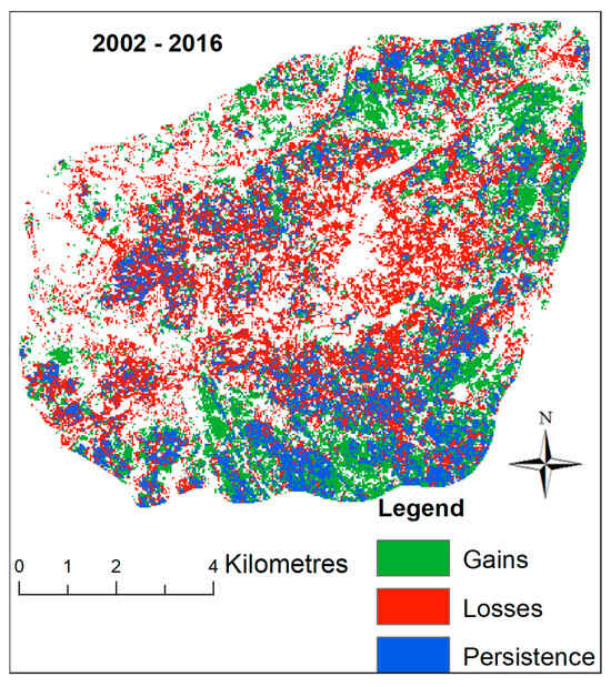 Gain, loss, and persistence for agricultural land from 2002 to 2016 (Mbarara).