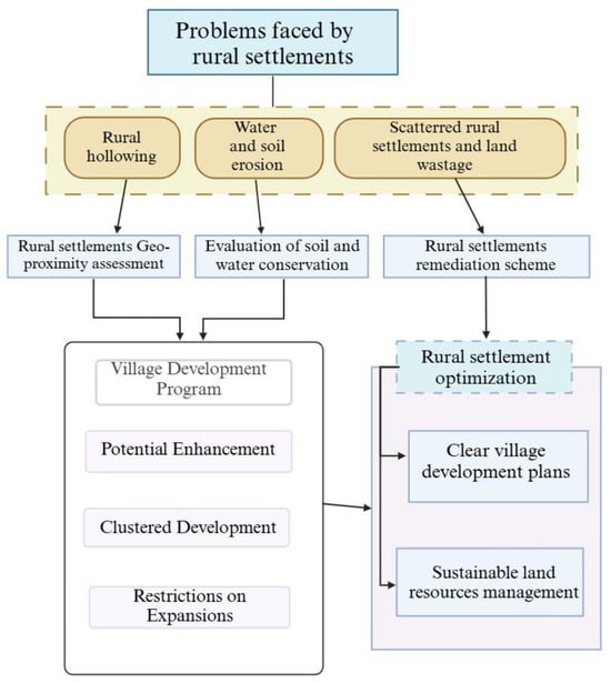 Rural settlements contain commercial, service, residential, industrial, school, and other lands located in the countryside and facilitate the production and life of rural residents. They represent the core of human–land relations in rural areas [1]. With the growth of global industrialization and urbanization, rural populations continue to migrate to cities, and the hollowing out of the countryside has become an issue of concern for scholars worldwide, especially for developing countries [2]. Scholars from India, Indonesia, Vietnam and Iran have focused on problems such as the unequal availability of infrastructure for rural dwellers and the threat of urban sprawl onto arable land and the rural natural environment. There are some evident signs of the extinction of traditional handicraft villages. While urbanization allows for villagers to enjoy better health care, communication services, and housing security, it also increases the tax burden, shrinks agricultural land, and destroys the natural environment [3,4,5,6]. With the implementation of China’s reform and opening-up policy, urbanization has intensified. The hollowing out of the countryside has intensified, and the problems of the uncontrolled expansion and idleness of rural settlements have occurred simultaneously [7]. The problem of urban sprawl, represented by unused rural settlements, has attracted the attention of all sectors of society [8]. In the mid-1990s, the Chinese government initiated a pilot land consolidation program in some areas to conserve land resources by merging rural settlements with large-scale centralized settlements, which was developed into a national policy in 2008 [9]. After nearly 30 years of land consolidation, some of the pilot regions have improved the efficiency of public services, reduced land waste, and improved living and housing conditions [10]. On the other hand, the spatial distribution of rural settlements varies significantly across different regions and is influenced by factors such as location, elevation, and precipitation. At present, however, the majority of rural land remediation programs involve the complete relocation of rural settlements, and remediation programs tailored to the characteristics of a specific region are lacking [11].