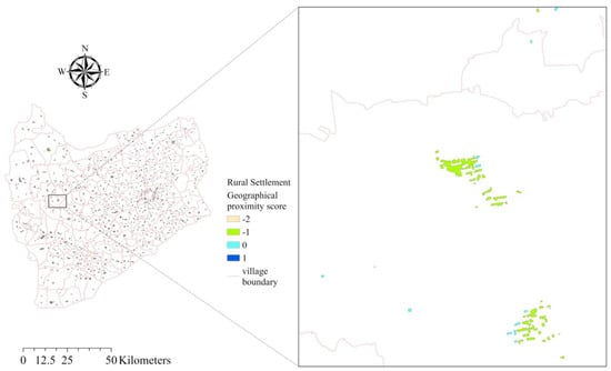 The results of the geographical proximity assessment of rural settlements show that rural settlements with scores of 0 and −1 are widely distributed in all villages in Tong Yu County, in which the area of rural settlements with scores of −1 accounts for more than half of the total area of rural settlements. In contrast, the sum of the areas of the rural settlements with scores of 1 and −2 is less than 10%, which is only distributed in some villages. There is a situation in which patches with scores of 1 and those with scores of −2 are in the same village.
