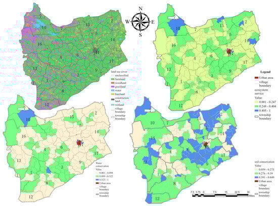 Combining the rank of the village geographical assessment with the results of the ecosystem soil and water conservation function evaluation grading, Tong Yu County villages were divided into three types: potential enhancement, agglomeration development, and restriction of expansion (see Table 8 and Figure 7).