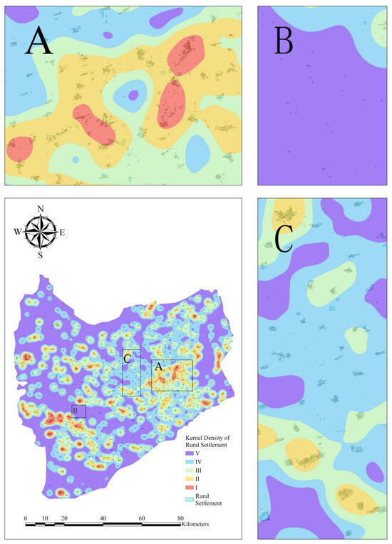 Distribution of the kernel density and size of rural settlements. Note: A, B, C represent the size and distribution characteristics of rural settlements at different kernel densities.