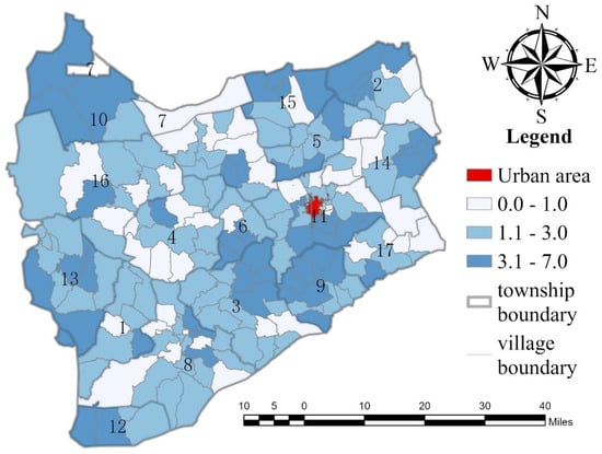 The total number of rural settlements in Tong Yu County is 21,110, and the outcome of the rural settlement geographical proximity assessment score was calculated into four grades from low to high: 1, 0, −1, and −2, respectively. A settlement patch with the richest living resources is given a score of 1; if it has a score of −2, then the settlement is relatively under-resourced for subsistence (see Table 3). The scores of the rural settlement patches were statistically averaged village-by-village to obtain the results of a geographical assessment of administrative villages in Tong Yu County (see Table 4).
