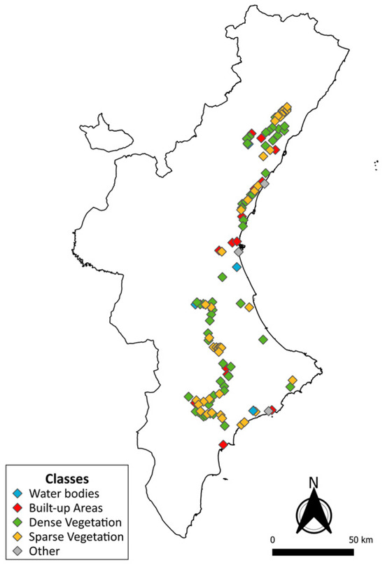 In this study, the classification was carried out for the Valencian Community area, using more than 1000 points for each year for training (Table 1). Due to the large amount of information to be analysed, all processing was performed via GEE. To implement the algorithm, we used the SmileRandomForest function, a Classifier package that handles supervised classification by traditional machine learning algorithms. GEE’s RF classifier offers various customisation options, such as the number of decision trees to create, the size of the input subset per tree, and the maximum number of parent nodes for each tree. The algorithm was applied using 150 decision trees in order not to excessively increase the computational cost while maintaining good accuracy, as recommended by Oshiro et al. [41]. Default values were maintained for the other parameters.