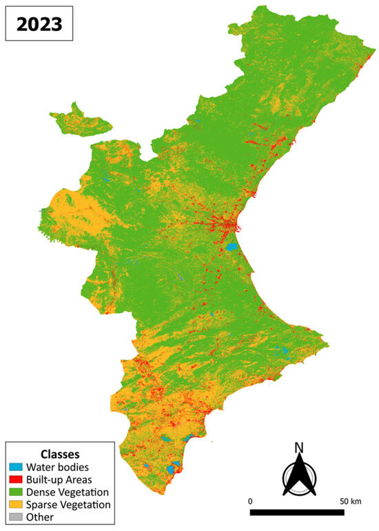 In this study, we conducted a comprehensive analysis of land cover dynamics in the Valencian Community, spanning from 1984 to 2023. Employing advanced algorithms, specifically RF and CART, we initially classified the land cover for the year 2023 using Landsat 9 imagery. The accuracy test results favoured RF, demonstrating superior OA (0.95) and Kappa coefficient (0.93) compared to CART. The subsequent validation process with in situ data highlighted the model’s generally accurate reflection of real land cover, notwithstanding occasional misclassifications, particularly in Sparse Vegetation. This discrepancy was attributed to challenges in precisely assessing the vegetation density from ground-level perspectives, mitigated by the consistent identification of these areas as vegetation. Moreover, mapping extensive areas in complex landscapes proved challenging due to environmental gradients influencing spectral differentiability. Subsequent temporal analysis revealed a notable surge in urbanised surface area, affecting vegetation classes. Notably, the Built-up Areas class exhibited a substantial 95% increase from 1984 to 2022, displaying consistent urban expansion trends. Linear and polynomial adjustments further affirmed this growth pattern, with the Built-up Areas class demonstrating a polynomial regression fit (R2 of 0.95).