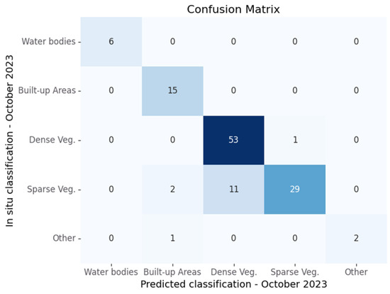 Regarding the validation of the algorithm, the confusion matrix (Figure 5) reveals a generally accurate reflection of real land cover. There is an exception in the classification of sparse vegetation, occasionally misidentified as dense vegetation. This discrepancy may arise from the challenge of precisely assessing vegetation density from ground-level perspectives, where the angle of vision varies, making it difficult to discern the intensity/density of vegetation. However, it is important to highlight that the classification consistently identifies these areas as vegetation, mitigating the impact of the error. It is worth remembering that mapping extensive areas in complex landscapes proves challenging due to abrupt changes in environmental gradients such as humidity, altitude, and temperature. These diverse landscapes exhibit land cover categories that are challenging to differentiate spectrally, given the low separability between classes and high intra-class variability [24].