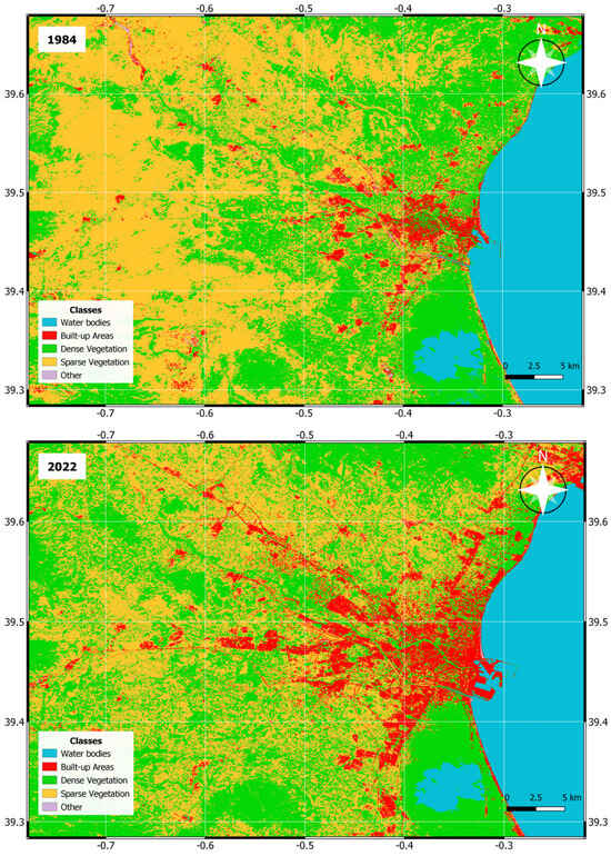 After model validation, a temporal analysis of land cover change in the Valencian Community was conducted utilising Landsat 5–9 imagery spanning the period from 1984 to 2022. All classification maps obtained can be referenced in Appendix A. Figure 6 provides a zoomed-in depiction of the city of Valencia, showcasing the classification maps derived from Landsat 5 in 1984 and Landsat 9 in 2022, respectively.