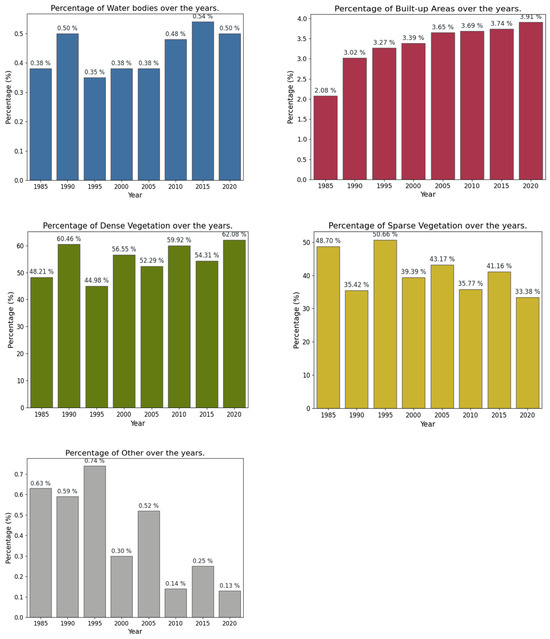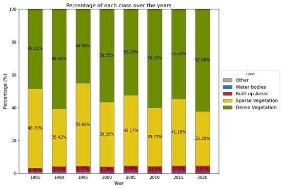 In the case of the Built-up Areas class, a discernible and consistent growth pattern is evident, increasing from 2.08% in 1985 to 3.91% in 2020 (Table 3 and Table 4). Conversely, other classes do not exhibit a clear growth or decline trajectory. Notably, the combined areas of Dense and Sparse Vegetation classes remain relatively constant, indicating an inversely proportional relationship between the two classes. This observation aligns with the annual variations in crop density during the summer season, as well as with the variations in overall vegetation density and intensity. Figure 8 presents a composite graph where the percentages occupied by all classes are collectively represented for each year. In the majority of instances, Dense Vegetation emerges as the predominant class, occupying the highest percentage.