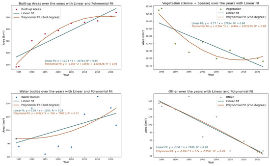 Polynomial regression performed in the Built-up Areas class (top left), Dense + Sparse Vegetation (top right), Water Bodies (bottom left), and Other (bottom right), spanning the period from 1984 to 2022.