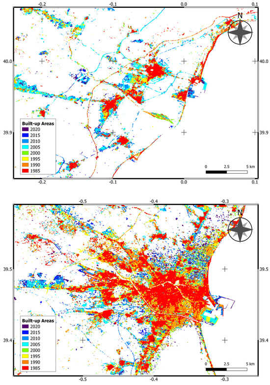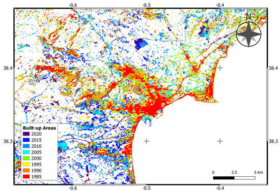 In Figure 10, a superimposition of the Built-up Areas classes for all years, each represented by a distinct colour, facilitates the observation of urban growth in the cities of Valencia, Alicante, and Castellón throughout the study interval. We can observe that the most significant urbanisation impact occurred from 1985 to 1990, as previously discussed. Additionally, the introduction of ports in 2005 (absent in 2000) and their subsequent expansions in 2010, 2015, and 2020 are discernible.