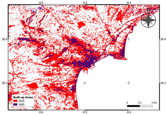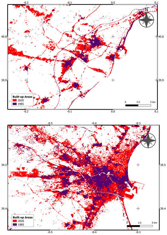 Analysing the percentage of ‘Built-up Areas’ in 2020 of these regions, we observed a rise of 110.37% (an additional 56.59 km2) in Castellón, a 70.47% increase (adding 143.30 km2) in Valencia, and a remarkable growth of 157.68% (an addition of 100.20 km2) in Alicante, compared to 1985 (Figure 11), revealing a significant increase over these 35 years.