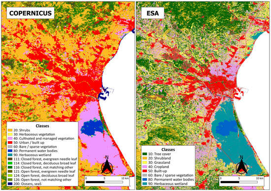 These discrepancies may arise from the higher resolution of our product, allowing for the differentiation of various urban cores within cities and the recognition of different vegetation types in between, while the other products represent cities as a single compact urban area, as can be noticed in Figure 12. Furthermore, the non-exact correspondence of the classes used in the different land covers certainly has an effect on the inaccuracy of the comparison.
