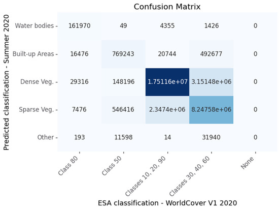 In our research, we assess the congruence between our product for the year 2020 and the one computed by ESA for the same year. ESA’s product comprises eleven distinct land cover categories, which we have grouped to simplify the comparison process. We categorised Tree Cover, Shrubland, Mangroves, Moss and Lichen, and Herbaceous Wetland classes as Dense Vegetation. Sparse Vegetation encompasses the Grassland and Cropland classes, while Built-up Areas represent the Built-up class. Water Bodies include the Snow and Ice and Permanent Water Bodies classes, and the Bare/sparse Vegetation class falls under the category of Other. Additional information on the classes and the product can be found in the User Manual edited by Zanaga et al. [58].