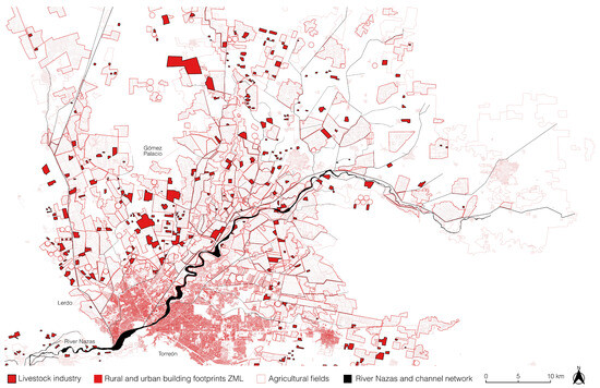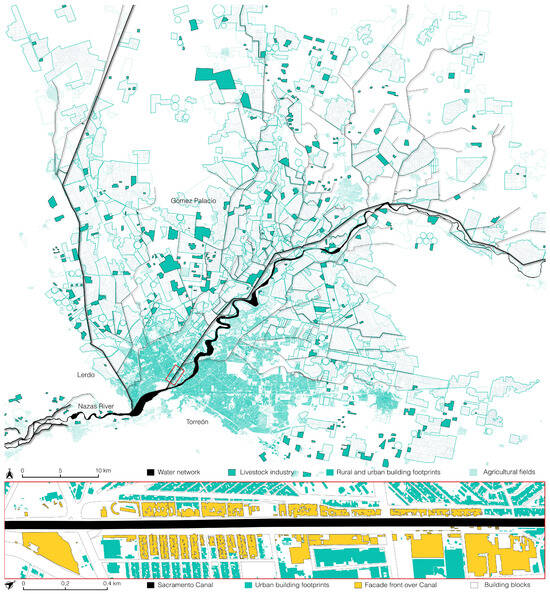 Through a multi-scale analysis of the land use patterns and surface features within the territory, the impacts of Nazas River regulation on the hydrological region can be observed [43]. This analysis also facilitates the examination of changes in urban components that interact with the canal network. By comparing agricultural and land use patterns with the hydrographic network across the region, opportunities for river restructuring and restoration can be identified, with the aim of enhancing benefits for the populations that reside within the basins [24].