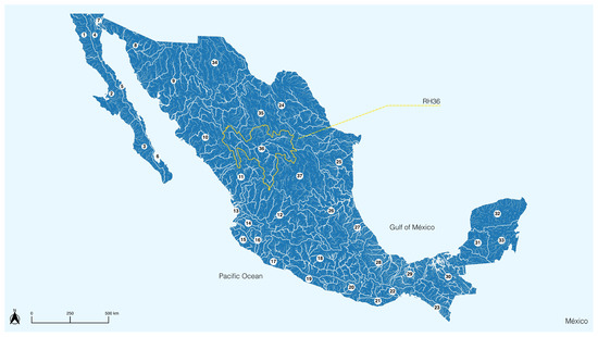 In the Mexican territory, 37 hydrological regions (RH) have been identified (Figure 4 and Table 1). These regions are subcategorized as basins and sub-basins, to integrate the hydrographic systems. The limits of these regions are represented by the geographic borders of the basins they group. The following graphic and table present the hydrological regions defined by CONAGUA [1] in Mexico and their main characteristics. The RH36 focus of this study is highlighted.
