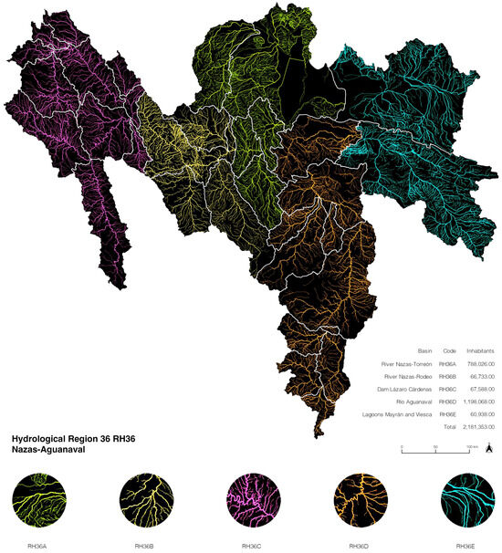 Basins that comprise the hydrological region 36 Nazas–Aguanaval. Graphic by the authors, based on geospatial data from INEGI. Hydrographic network scale 1:50,000, Edition 2.