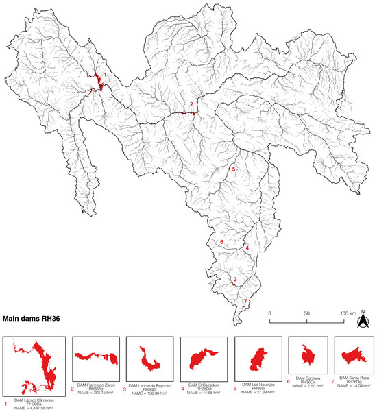 Main dams located in hydrological region 36 (RH36). Graphic by the authors, based on geospatial data from INEGI and CONAGUA.