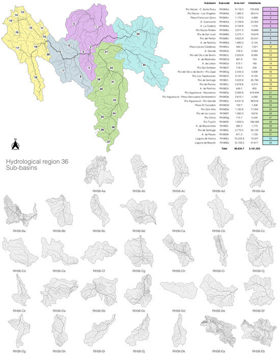 Hydrological region 36 contains 33 sub-basins according to INEGI information available in its vectorized form. To calculate the number of inhabitants of each sub-basin, a database has been generated by adding the attributes of the 2020 geostatistical framework through the Single Catalog of Keys for State, Municipal, and Local Geostatistical Areas (Catálogo Único de Claves de Áreas Geoestadísticas Estatales, Municipales, y Localidades) (Figure 7). The area of each sub-basin can be calculated from the properties of the geometry provided in the vectorized information from INEGI. The resulting map unifies geographical and cadastral information. This type of map is important in order to visualize the basins and sub-basins that have a higher concentration of population, and therefore a higher degree of domestic water consumption. Notably, the sub-basins RH36A, the north of RH36D, and RH36E comprise the lower basin of RH36, and they also comprise more than 90% of the population in the entire region.