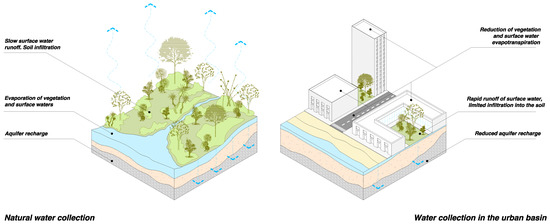 On this scale of order (city—architecture), the dynamics of water consumption uses that are closer to the citizens can be observed. For example, construction typologies can be examined, and the amount of water needed for the individual construction materials determined. This information can be used to approximate the water footprint per m3 of construction. Another example of analysis at this scale is the relationship between buildings and canals through façade fronts. The type of soil, waterproofing, urban basin drainage, infiltration, and recharge capacities, with their disruptions to the hydrological cycle, can also be observed. The results obtained from the analyses carried out between the very fabric of the cities and the road structure that joins them can provide relevant information for the reordering and identification of harmful trends within the hydrological cycle of a given basin.