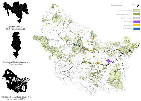 Regarding the production surfaces, the vector layers provided by the National Agrarian Registry (RAN) of Mexico are added to the water structure network. The integrated information belongs to the categories of areas divided into plots, RHA [1] irrigation units, and irrigation districts. This is the plot information that is available at this geographic scale for the Mexican territory. It is important to focus on production surfaces since they are the spaces with the greatest consumption of water resources in the basin [1]. With the addition of this layer of information, the main anthropized surfaces in the basin under study can be identified. In general, it is evident that major settlements are located along the main water streams of the hydrographic system. At this scale, a pattern of location among the majority of settlements and their surfaces is recognizable. This information allows us to understand rural and urban locations as part of a whole system that is dependent on the water cycle.