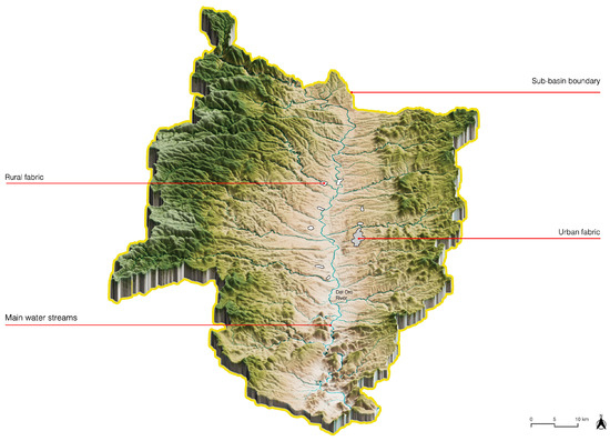 At this scale of work, a three-dimensional view of the sub-basin offers a useful perspective to visualize the set of urban and rural communities, and their crops and locations with respect to the main water bodies (Figure 12). Three-dimensional axonometry is considered more useful than a two-dimensional section, mainly because it better shows the topography and continuity of the streams and their links with population centers.