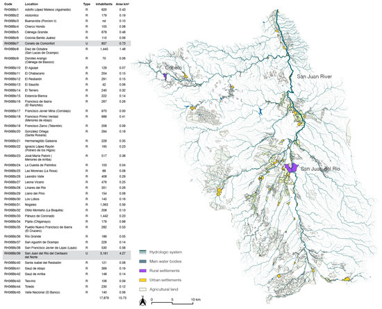 Once the hydrographic network has been incorporated within a defined cartographic projection, the available geospatial data need to be added from the rural and urban settlements under analysis. To achieve this, access vector information is required from the urban and rural blocks, which in this case comes from the INEGI geostatistical framework [42]. These two layers of information are fundamental to understanding settlement locations throughout the entire basin and sub-basins. Along with this information, site levels can be added for a better understanding of the geomorphological characteristics of a basin and sub-basin.