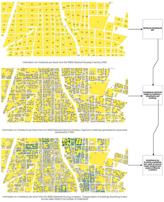 For Mekonnen and Hoekstra [38], the global average water footprint, associated with consumption and estimated for the period 1996–2005, is 1385 m3 per person per year. For Mexico, it is 1978 m3. The process of integrating water footprint into building footprints can be carried out either by adding the information directly to the vector database of the buildings or by means of the specific coordinates of each polygon through the join attributes by location algorithm within QGIS. The join attributes by location algorithm complements a certain database that contains the attributes of certain vector information.