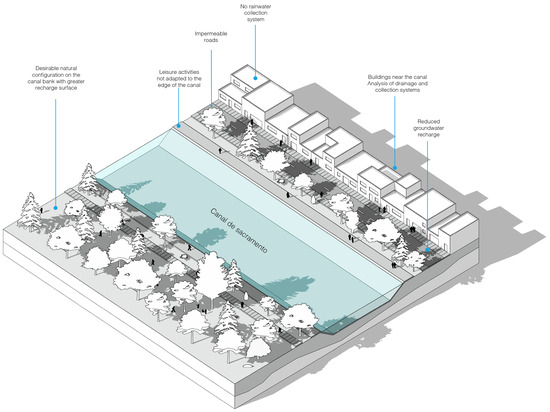 In RH36, the analysis of the interaction between buildings and canals is fundamental, considering that the irrigation district network 017 located in RH36 has over 1200 km of canals and drains [57]. The treatment of streets and façade fronts must focus on the preservation of water resources and their distribution, mainly in highly populated areas where water flows are vulnerable to the economic dynamics of urban centers (Figure 22, Figure 23 and Figure 24).