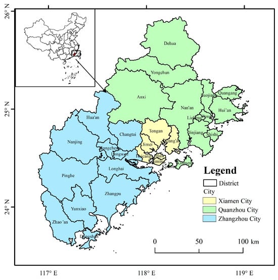 The Xia-Zhang-Quan urban agglomeration (Figure 1) is located in Fujian Province, a rapidly urbanizing region in southeast China, often called the “Golden Triangle of Southern Fujian”. This area encompasses the cities of Xiamen, Zhangzhou, and Quanzhou, covering approximately 26,000 square kilometers. According to data released by the Bureau of Statistics in March 2023, the permanent population in 2022 was 5.308 million for Xiamen, 5.068 million for Zhangzhou, and 8.879 million for Quanzhou. Additionally, the Fujian government reported that the GDPs for Xiamen, Zhangzhou, and Quanzhou in 2022 were 730.66 billion CNY, 570.66 billion CNY, and 1220.97 billion CNY, respectively, collectively accounting for about 48.22% of the province’s GDP. Overall, the Xia-Zhang-Quan urban agglomeration is the most economically developed and densely populated region in Fujian Province.