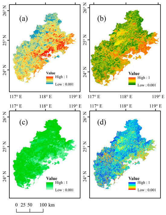 The normalized index of the heat, humidity, dryness, and greenness in 2022: (a) the heat, (b) dryness, (c) greenness, and (d) humidity.