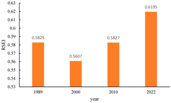 By analyzing the RSEI index, it is possible to study the ecological environmental changes in the Xia-Zhang-Quan urban agglomeration from 1989 to 2022. It can be concluded that the ecological environmental quality index RSEI of the Xia-Zhang-Quan urban agglomeration was 0.5829, 0.5607, 0.5827, and 0.6195 in 1989, 2000, 2010, and 2022, respectively, showing a trend of first decreasing and then increasing; the overall trend was still increasing (Figure 3). Compared with 1989, the RSEI in 2022 increased from 0.5829 to 0.6195. With an increase of 6.3%, the ecological environment quality of the Xia-Zhang-Quan urban agglomeration has improved in the past 30 years.