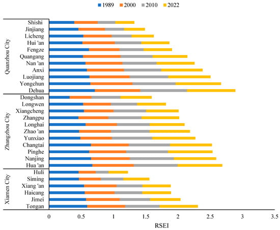 The average value of the RSEI index of each county-level administrative region of the Xia-Zhang-Quan urban agglomeration was calculated, and the statistical results are shown in Figure 4. Among the three prefectural-level administrative regions of the Xia-Zhang-Quan urban agglomeration, the average value of the RSEI index of Zhangzhou is the highest, which is 0.5532, indicating that its ecological environmental quality is the best among the three cities. The mean value of the RSEI index in Quanzhou is 0.5228. The average RSEI index of Xiamen is the lowest among the three cities, which is 0.4546, and its ecological environmental quality is the worst among the three cities. From the four periods of the RSEI index and its mean value of each district and county from 1989 to 2022, it can be found that during the 30 years, the mean value of the RSEI index of Hua ‘an County, Nanjing County, Pinghe County, and Changtai County in Zhangzhou City, and Dehua County and Yongchun County in Quanzhou City are all higher than 0.6, indicating that the ecological environmental quality is at a relatively high level. However, the average RSEI index of Siming District and Huli District in Xiamen City, Dongshan County in Zhangzhou City, Jinjiang City, and Shishi City in Quanzhou City is lower than 0.4, indicating that the ecological environmental quality is of a relatively low level.