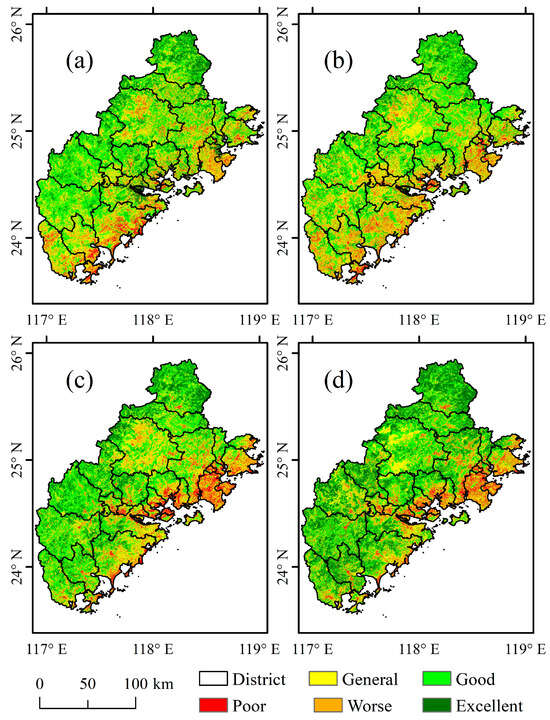 In order to better visualize the ecological quality of the Xia-Zhang-Quan urban agglomeration, this study refers to the “Quality Evaluation of Ecological Environment Quality in China”, and divides the normalized RSEI index into five grades at an interval of 0.2. The RSEI index within the range of [0, 0.2] means that the ecological environment quality is “poor”. The RSEI index in the range of (0.2, 0.4) means that the ecological environment quality is “worse”. The RSEI index in the range of (0.4, 0.6) means that the ecological environment quality is “average”. The RSEI index in the range of (0.6, 0.8) means that the ecological environment quality is “good”. The RSEI index in the range of (0.8, 1] means that the ecological environment quality is “excellent”. A description of each level is as follows: