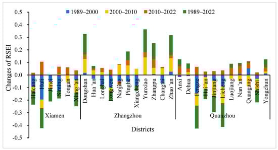 RSEI changes average in the districts of the Xiamen-Zhang-Quan urban agglomeration from 1989 to 2022.