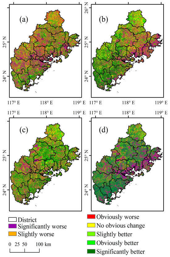 Levels of RSEI changes in the Xiamen-Zhang-Quan urban agglomeration from 1989 to 2022. (a) 1989–2000, (b) 2000–2010, (c) 2010–2022, and (d) 1989–2022.