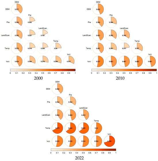 Using the factor detector, we analyzed the explanatory power of each factor on the spatial heterogeneity of ecological environment quality. As shown in Table 7, all factors except for the 2022 temperature data significantly impact the spatial differentiation of ecological environment quality. A larger q-value indicates a greater contribution of the driving factor to the spatial heterogeneity of ecological environment quality in the study area. In 2000, FVC > LUCC > DEM > Temp > LandScan > Pre. In 2010, LUCC > FVC > DEM > LandScan > Temp > Pre. In 2022, LUCC > LandScan > DEM > FVC > Pre. Overall, the explanatory power of land use on the spatial differentiation characteristics of RSEI has become increasingly significant, precipitation has the weakest explanatory power, and the influence of vegetation coverage has also diminished over time. This indicates that with the progression of urbanization, the explanatory power of land use for spatial heterogeneity in ecosystem quality changes accordingly. In 2000, vegetation coverage was the primary determinant of spatial differentiation in ecological environment quality. By 2022, land use had become the dominant factor, with the influence of precipitation being relatively minor.