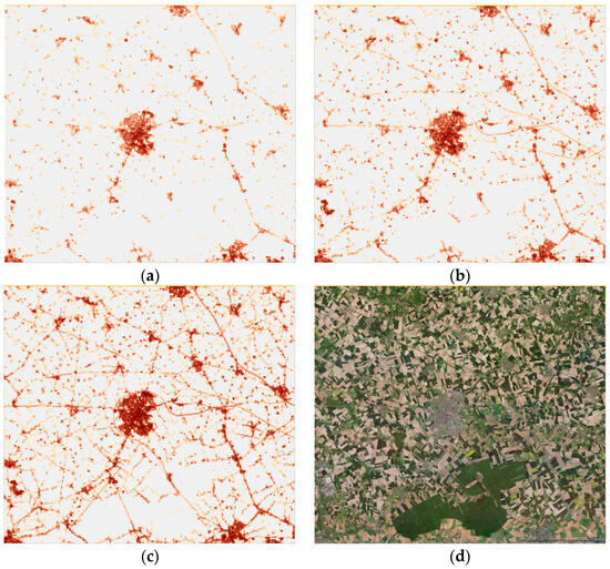 Datasets based on remote sensing are available from the Copernicus Land Monitoring Service (CLMS) and include the CLMS CORINE Land Cover + Backbone (CLC+ BB) for 2018 [3] (2021; available at end of 2024) and the time series of the imperviousness degree layer [4], every 3 years from 2006 to 2018 (2021; available at end of 2024). Other global data sources exist, such as the Global Human Settlement Layer (GHSL) described in [5] and the World Settlement Footprint (WSF) [6]. However, both GHSL and WSF are global products and their respective definitions are more focused on assessing built-up areas, with a focus on buildings, whereas roads or parking spaces are not considered when disaggregating population census data into a gridded product.