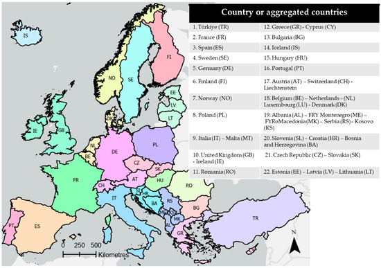 The level of reporting by country or aggregated countries (smaller countries were aggregated to ensure a minimum area of 90,000 km2) as applied in the Copernicus Land Monitoring Service external validation contract.