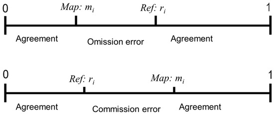 Among the possible disagreement indicators, we propose to quantify the disagreement at the PSU level as the differences between the map value mi and the reference ri. The Mean Absolute Error (MAE), , where wi is the extrapolation weight (inverse of the sampling intensity), and Root Mean Square Error (RMSE), are common metrics used in this context and are currently used to assess the accuracy of the Global Human Settlement Layer (GHSL, [27] also now produced as part of the Copernicus Global Land initiative). In addition, if the map value is larger (lower) than the reference value for a PSU, it will contribute to the commission (omission) error as illustrated in Figure 4.
