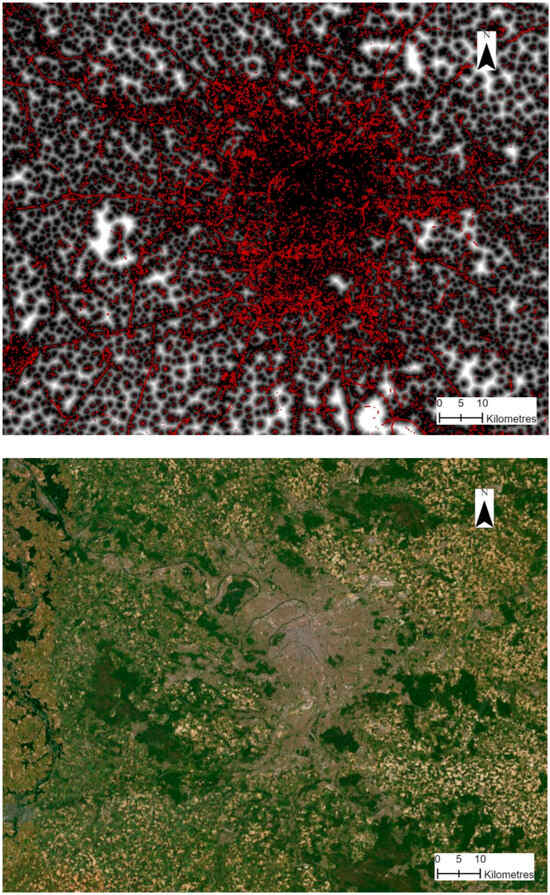 (Top): distance layer from 2015 imperviousness degree status layer (gray tones, with darker areas representing smallest distance) and candidate gain areas in red from 2015–2018 imperviousness classified change layer. (Bottom): a corresponding is Sentinel 2 image.