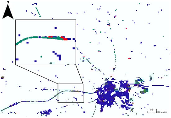 A distance threshold was then applied interactively to gain objects for each calibration unit to obtain, as close as possible, the required adjustment. Gain objects within the distance threshold to existing sealed areas (in the 2015 layer) were classified as actual gain and objects outside were classified as omissions as shown in Figure 7. Most omissions appear to represent either road segments now classified using the higher spatial resolution of the Sentinel 2 input data or some large objects. In the enlarged extract shown, green objects are classified as omissions because the mean Euclidian distance of these objects is above the threshold set for these calibration units, whereas red objects are classified as change.