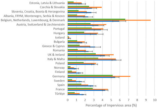 Percentages of impervious areas for large countries and groups of countries from EEA38 + UK for the validation reference, imperviousness degree and harmonized imperiousness change datasets for 2018 with the 95% confidence interval for the reference data.