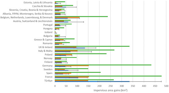 Total gain in impervious areas for countries/group of countries for 2015–2018 from EEA38 + UK for validation reference, CLMS IMD and harmonized imperiousness change datasets for 2018 with 95% confidence interval for reference data.