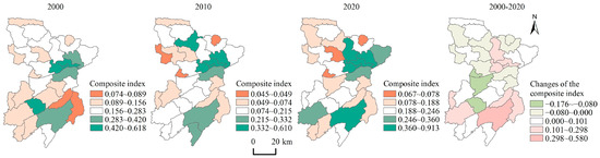 This paper utilized the composite index of rural functions in each township to measure the degree of RFD (Figure 4). In summary, the composite index of RFD increased in most of the townships from 2000 to 2020. The average composite index has risen from 0.222 in 2000 to 0.281 in 2020, and the level of functional diversification in the rural areas has enhanced, with comprehensive development of production, living, and ecological functions. Influenced by socio-economic development, the high-value townships were concentrated in the central and southern regions of Fengjie County, which were more developed.