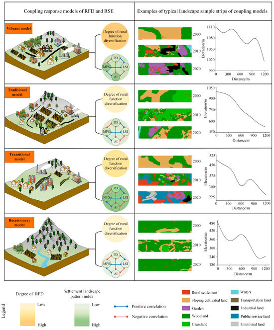 (3) According to the relationship between the composite index of RFD and the composite index of RSE, we divided the townships into four coupling response models: vibrant model, recessionary model, transitional model, and traditional model. The interrelationships between rural functions and settlements in different coupling models were distinctive.