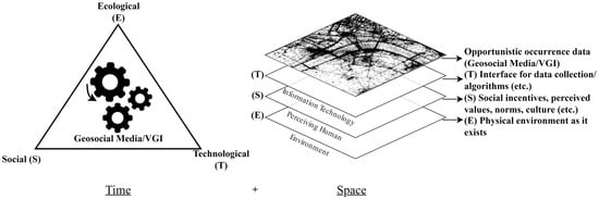 SETS framework for separating three types of couplings influencing opportunistic data collection through geosocial media and VGI over time (left) and space (right).