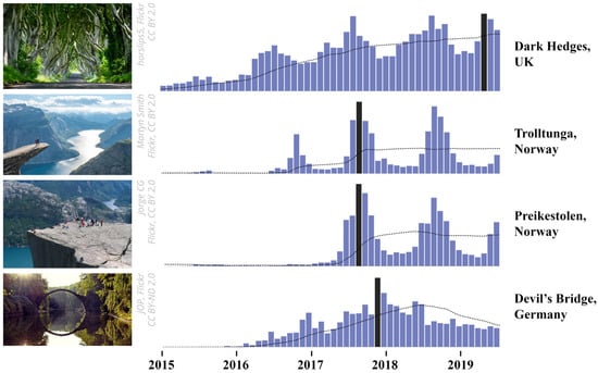To begin exploring questions of why and how, a common first step in interpreting such graphs is to formulate hypotheses []. Comparing relative differences is an important key task, as absolute post volume is not a robust and reliable measure []. We accounted for this fact by scaling the y-axes between the minimum and maximum values in Figure 2 and by omitting absolute values. Based on visual comparison, the relative differences between the four graphs can be grouped into three categories. Dark Hedges, a famous avenue of old beech trees in the UK made famous by the TV series “Game of Thrones”, shows a continuously increasing trend that also starts relatively early compared to the other locations. In contrast, the two viewpoints Trolltunga and Preikestolen in Norway both show a strong seasonal trend, peaking in the summer months. For these two sites, the first significant peak in Instagram post volume also appeared relatively late in 2016–2017. As an outlier, the Devil’s Bridge in Germany, known for its distinctive water reflection that forms a full circle, shows an increasing trend in Instagram posts that peaks in the fall of 2017 and then suddenly declines. In contrast to the other three locations, the Devil’s Bridge graph shows no noticeable seasonal patterns.