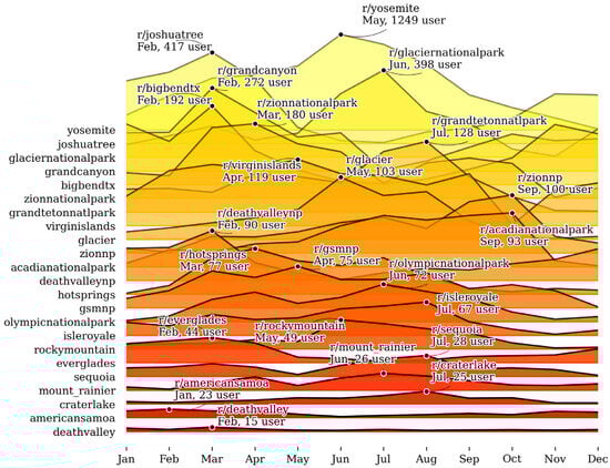 Clearly delineated contexts with a single phenomenon and pole as a common denominator, as in the first example, are unfortunately rare in landscape change assessment. Many contexts require the study of landscapes at smaller scales, often covering large regions with many phenomena and a variety of perceiving user groups. This not only requires more effort to query, filter, and map data but also reduces the specificity of hypotheses that can be identified from exploring patterns. To illustrate such a context, we selected a list of 20 Reddit subreddits related to US national parks for the second example. The list of subreddits is comparable to the list of Instagram locations in the first example. Both gazetteers allow analysts to examine a set of locations or regions (E) from the perspective of a selected group (S) of users on a particular platform (T). Figure 3 shows the average monthly post and comment volume for the Reddit data for each park. The graphs are stacked into a single visualization. This type of visualization, also known as a Joyplot, is particularly useful for comparative analysis of changes in distributions over time []. The Joyplot sorts the graphs for the national parks in descending order of importance based on the average volume of data per month. To avoid obscuring parks with less communication, parks with the most comments are shown in the background.